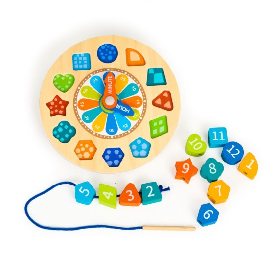 W komplecie z zegarem znajduje się specjalny sznurek, na który dziecko może nawlekać kolorowe klocki. Taka forma zabawy rozwija zdolności manualne oraz motoryczne dziecka, a dodatkowo stwarza okazje na lekcje nauki liczenia, czy rozpoznawania cyfr i liczb.