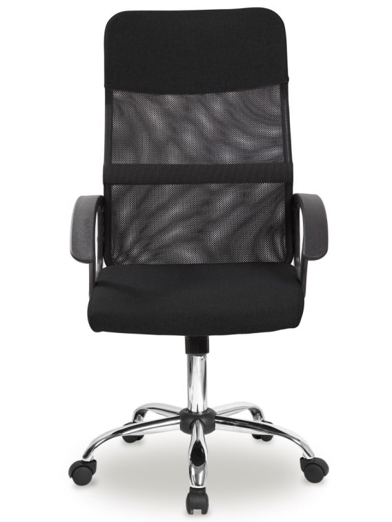 - Fotel biurowy w kolorze czarnym z wygodnym, zapewniającym wentylację siateczkowym oparciem.