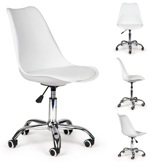 Do prawidłowego funkcjonowania podczas pracy przy biurku potrzebne jest krzesło, które umożliwi nam długą komfortową pracę przed komputerem. Krzesło obrotowe marki ModernHome jest idealnym rozwiązaniem dla biur, domowych stanowisk pracy lub recepcji, czy salonie usługowym. Biała kolorystyka z chromowanymi dodatkami sprawdzi się idealnie w nowoczesnych wnętrzach.