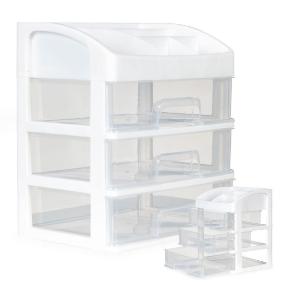 Trzy przezroczyste szuflady: pojemne szuflady zapewniają dodatkową przestrzeń do przechowywania większych kosmetyków, jak podkłady, palety cieni do powiek czy pędzle. Szuflady są przezroczyste, co ułatwia identyfikację zawartości bez konieczności ich otwierania.