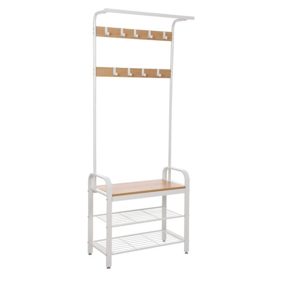 Prezentujemy stojak na ubrania z siedziskiem i półkami na buty, który wprowadzi ład i porządek. Ten praktyczny mebel uporządkuje Twoją odzież wierzchnią, galanterię oraz inne drobiazgi jak np. klucze.