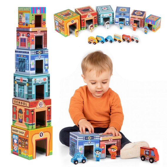 • Kreatywna konstrukcja - to prawdziwa gratka dla małych budowniczych! Kolorowe, sześcienne pudełka można układać w wysoką wieżę lub zestawiać jako rozbudowane miasteczko. W trakcie zabawy dziecko naturalnie rozwija koordynację, orientację przestrzenną oraz umiejętność dopasowywania kształtów. Każda kostka jest ponumerowana (od 1 do 6) i opatrzona angielską nazwą budynku, co wprowadza cenny element edukacyjny.